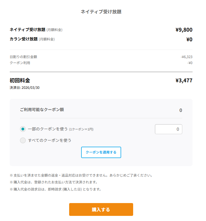 つまり、前日加入&解約で、326円で1日ネイティブ講師受け放題という技も!