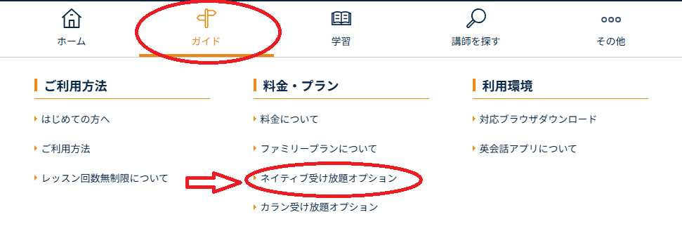 ホーム画面の「ガイド」にカーソルを合わせると、下記のようなメニューがでてくるので、「ネイティブ受け放題オプション」をクリック。